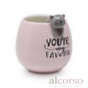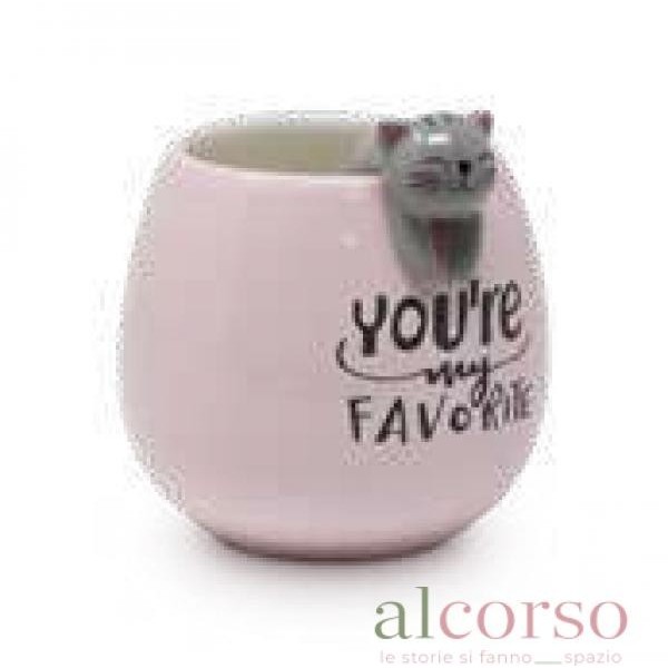 Design: Tazza rosa con gatto sul bordo e scritta decorativa